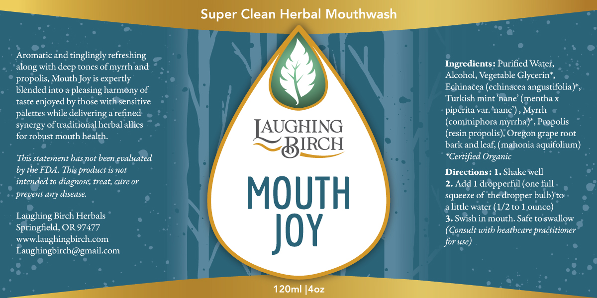 This mouthwash tincture/concentrate is your best friend for your daily mouth care regimen. Just squirt a dropperful into an ounce of water and swish around in your mouth after brushing. Because you add the water, our ecologically-sound, compact tincture bottle is ready for travel and is much smaller than bulky, pre-mixed plastic mouthwash bottles. Tingly, aromatic and refreshing, along with the deep tones of potent resins…this formula crafts a refined synergy of powerful herbs into a pleasing harmony of taste, good day after day. Nothing like some other harsh-tasting mouthwashes with overpowering menthol-containing mints or startlingly strong herb oils—Mouth Joy is smooth on the palette while delivering a potent dose of traditional oral health herbs.